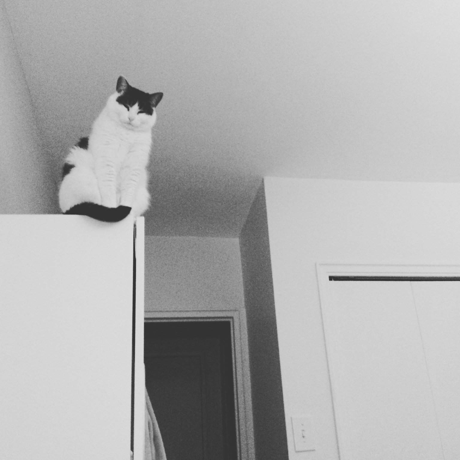 Leela looks so all-knowing up there. I used to have one of those beds that's like a bunk bed but without the second bed underneath, and our cat at the time used to loom over the edge and watch the whole room like that.