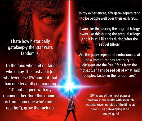 (Anonymous) 2023-12-31 02:05 pm (UTC)(link)As an adult, I enjoy knowing about the world and talking about it with close friends, but because of the rampant gatekeeping, I have zero interest in ever learning anything more. Why would I get invested in a story when someone is just going to shit on what I enjoyed?