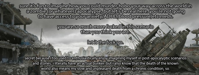 (Anonymous) - 2026-04-22 01:13 (UTC) - ExpandRe: What would take you out in a zombie apocalypse ?