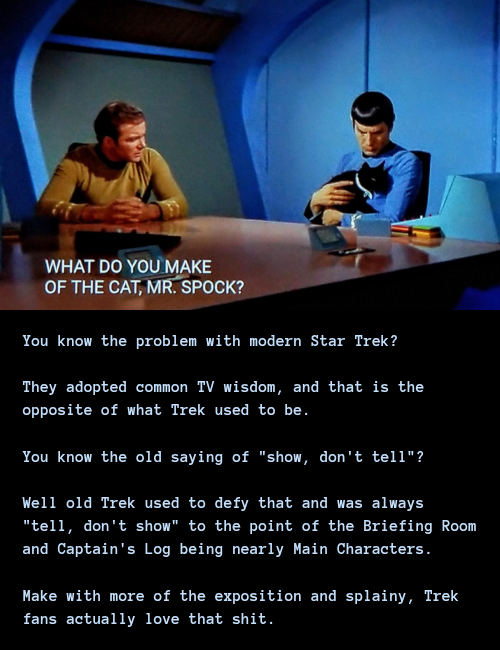Well old Trek used to defy that and was always "tell, don't show" to the point of the Briefing Room and Captain's Log being nearly Main Characters.