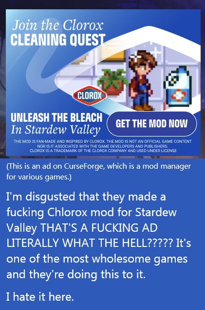 (Anonymous) 2026-04-26 10:34 pm (UTC)(link)I'm disgusted that they made a fucking Chlorox mod for Stardew Valley THAT'S A FUCKING AD LITERALLY WHAT THE HELL????? It's one of the most wholesome games and they're doing this to it. I hate it here.
