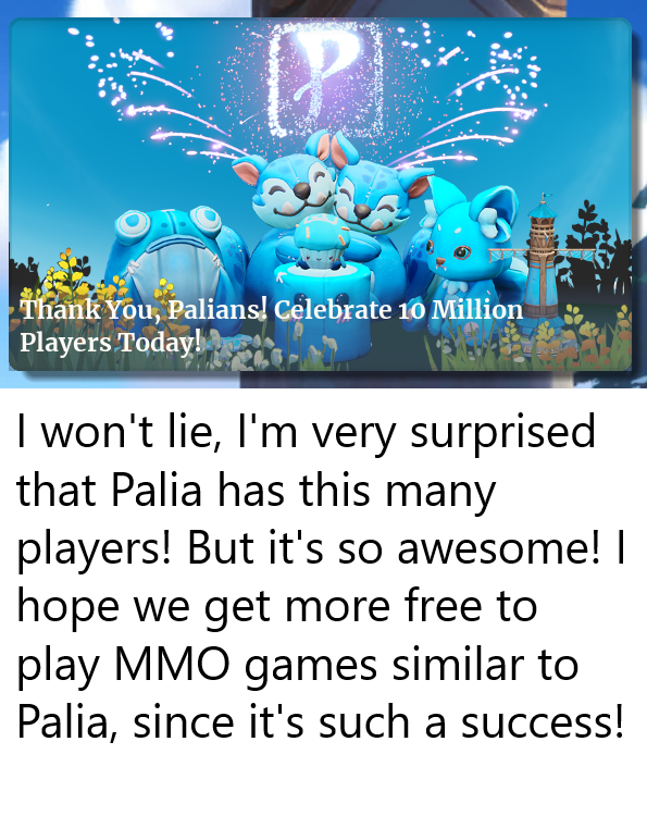 (Anonymous) 2026-04-29 11:27 pm (UTC)(link)I won't lie, I'm very surprised that Palia has this many players! But it's so awesome! I hope we get more free to play MMO games similar to Palia, since it's such a success!